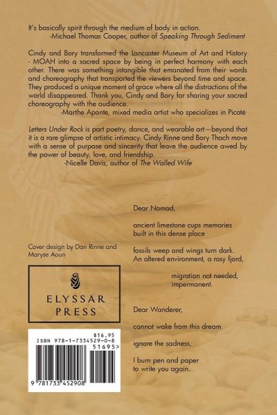 "Letters Under Rock" Poetry Performance collects from many landscapes and faith traditions: Morocco, Ireland, the Sahara, India, Japan, Cambodia, etc. Animism, angels, Tibetan Buddhism, Hinduism, Desert Mothers, Saints, etc. There are rituals, ghosts, forest spirits, rebirth, mollusk that tells a story, dragon, heron, swan. This story reaches across time and space told in love letters left under a rock of an orphan Wanderer and a Nomad.