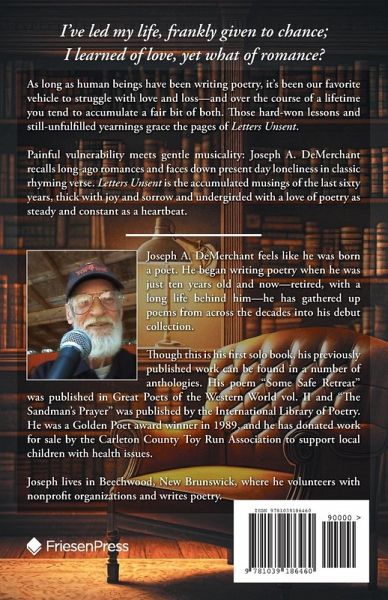 I've led my life, frankly given to chance; I learned of love, yet what of romance? As long as human beings have been writing poetry, it's been our favorite vehicle to struggle with love and loss-and over the course of a lifetime you tend to accumulate a fair bit of both. Those hard-won lessons and still-unfulfilled yearnings grace the pages of Letters Unsent. Painful vulnerability meets gentle musicality: Joseph A. DeMerchant recalls long-ago romances and faces down present day loneliness in classic rhyming verse. Letters Unsent is the accumulated musings of the last sixty years, thick with joy and sorrow and undergirded with a love of poetry as steady and constant as a heartbeat.