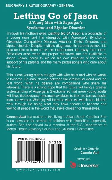 Through his mother's eyes, Letting Go of Jason is a biography of a young man and his struggles with Asperger's Syndrome, Obsessive Compulsive Disorder, Attention Deficit Disorder, and bipolar disorder. Despite multiple diagnoses his parents believe it is best for him to learn to live an independent life away from them. Difficulties arise when the proper resources are not available to Jason. Jason learns to live on his own because of the strong support of his parents and the many professionals who care about his future. This is one young man's struggle with who he is and who he wants to become. He must choose between the intellectual world and the real world. What he desires are companions who share his interests in computer networking and math. There is a strong hope that the future will bring a greater understanding of Asperger's Syndrome so that more young adults will have the adequate resources available to them to be successful men and women. What joy will there be when we watch our children walk through life being what they have chosen to become and feeling at peace in the world they have chosen for themselves.