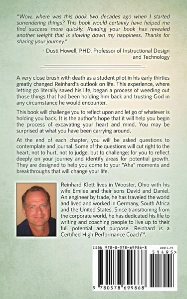 A very close brush with death as a student pilot in his early thirties greatly changed Reinhard's outlook on life. This experience, where letting go literally saved his life, began a process of weeding out those things that had been holding him back and trusting God in any circumstance he would encounter.This book will challenge you to reflect upon and let go of whatever is holding you back. It is the author's hope that it will help you begin the process of excavating your heart and mind. You may be surprised at what you have been carrying around.At the end of each chapter, you will be asked questions to contemplate and journal. Some of the questions will cut right to the heart, not to hurt, not to judge, but to challenge; for you to reflect deeply on your journey and identify areas for potential growth. They are designed to help you come to your "Aha" moments and breakthroughs that will change your life.
