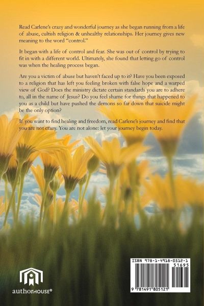 Read Carlene's crazy and wonderful journey as she began running from a life of abuse, cultish religion & unhealthy relationships. Her journey gives new meaning to the word "control." It began with a life of control and fear. She was out of control by trying to fit in with a different world. Ultimately, she found that letting go of control was when the healing process began. Are you a victim of abuse but haven't faced up to it? Have you been exposed to a religion that has left you feeling broken with false hope and a warped view of God? Does the ministry dictate certain standards you are to adhere to, all in the name of Jesus? Do you feel shame for things that happened to you as a child but have pushed the demons so far down that suicide might be the only option? If you want to find healing and freedom, read Carlene's journey and find that you are not crazy. You are not alone: let your journey begin today.