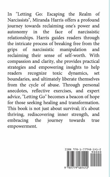 In "Letting Go: Escaping the Realm of Narcissists", Miranda Harris offers a profound journey towards reclaiming one's power and autonomy in the face of narcissistic relationships. Harris guides readers through the intricate process of breaking free from the grips of narcissistic manipulation and reclaiming their sense of self-worth. With compassion and clarity, she provides practical strategies and empowering insights to help readers recognize toxic dynamics, set boundaries, and ultimately liberate themselves from the cycle of abuse. Through personal anecdotes, reflective exercises, and expert advice, "Letting Go" becomes a beacon of hope for those seeking healing and transformation. This book is not just about survival; it's about thriving, rediscovering inner strength, and embracing the journey towards true empowerment.