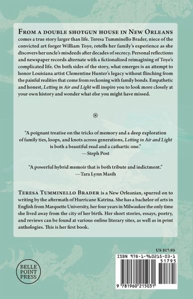 From a double shotgun house in New Orleans comes a true story larger than life. Teresa Tumminello Brader, niece of the convicted art forger William Toye, retells her family's experience as she discovers her uncle's misdeeds after decades of secrecy. Personal reflections and newspaper records alternate with a fictionalized reimagining of Toye's complicated life. On both sides of the story, what emerges is an attempt to honor Louisiana artist Clementine Hunter's legacy without flinching from the painful realities that come from reckoning with family bonds. Empathetic and honest, Letting in Air and Light will inspire you to look more closely at your own history and wonder what else you might have missed.