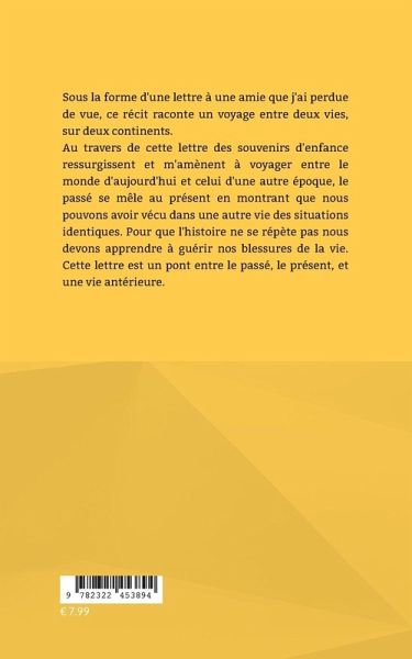 Sous la forme d'une lettre à une amie que j'ai perdue de vue, ce récit raconte un voyage entre deux vies, sur deux continents. Au travers de cette lettre des souvenirs d'enfance ressurgissent et m'amènent à voyager entre le monde d'aujourd'hui et celui d'une autre époque, le passé se mêle au présent en montrant que nous pouvons avoir vécu dans une autre vie des situations identiques. Pour que l'histoire ne se répète pas nous devons apprendre à guérirnos blessures de la vie. Cette lettre est un pont entre le passé, le présent, et une vie antérieure.