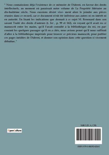 Texte à corriger : Imaginez un monde où le commerce des idées est à la fois une source de savoir et un champ de bataille économique. Denis Diderot, figure emblématique des Lumières, nous plonge dans cette réalité avec sa ' Lettre sur le commerce de la librairie '. Écrite au XVIIIe siècle, cette uvre se situe à une époque où la diffusion des livres est en pleine expansion, mais où les enjeux économiques et intellectuels se heurtent violemment. Diderot, avec sa plume acérée, explore les tensions entre les libraires, les auteurs et le public, dans un contexte où la censure et les privilèges d'édition façonnent le paysage littéraire. À travers cette lettre, Diderot aborde des thématiques essentielles telles que la liberté d'expression, la propriété intellectuelle et le rôle de l'écrivain dans la société. Il questionne la légitimité des privilèges accordés aux libraires et s'interroge sur l'impact de ces monopoles sur l'évolution des idées. Ce texte, à la fois critique et introspectif, met en lumière les défis auxquels sont confrontés ceux qui cherchent à partager leurs pensées avec le monde. En lisant cette uvre, le lecteur est invité à réfléchir sur la valeur des idées et sur les mécanismes qui régissent leur circulation. Diderot, par son analyse, nous offre une perspective sur les enjeux économiques et culturels de son temps, tout en résonnant avec les problématiques contemporaines de la diffusion du savoir. Ce livre nous enseigne l'importance de défendre la liberté intellectuelle et de questionner les structures qui peuvent entraver l'accès à la connaissance.