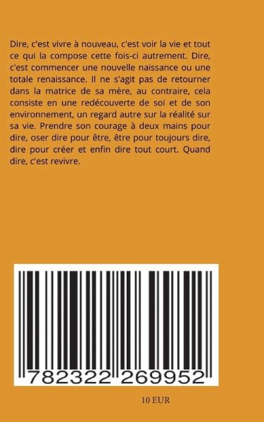 Dire, c'est vivre à nouveau, c'est voir la vie et tout ce qui la compose cette fois-ci autrement. Dire, c'est commencer une nouvelle naissance et totale renaissance. Il ne s'agit pas de retourner dans la matrice de sa mère, au contraire, cela consiste en une redécouverte de soi et de son environnement, un regard autre sur sa réalité de vie. Prendre son courage à deux mains pour dire, oser dire pour être, être pour toujours dire, dire pour créer et enfin dire tout court. Quand dire, c'est revivre.