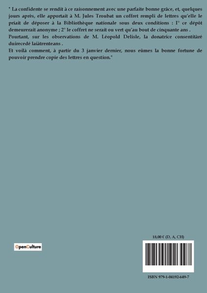" La confidente se rendit à ce raisonnement avec une parfaite bonne grâce, et, quelques jours après, elle apportait à M. Jules Troubat un coffret rempli de lettres qüelle le priait de déposer à la Bibliothèque nationale sous deux conditions : I° ce dépôt demeurerait anonyme ; 2° le coffret ne serait ou vert qüau bout de cinquante ans . Pourtant, sur les observations de M. Léopold Delisle, la donatrice consentitàré duirecedé laiàtrenteans . Et voilà comment, à partir du 3 janvier dernier, nous eûmes la bonne fortune de pouvoir prendre copie des lettres en question."