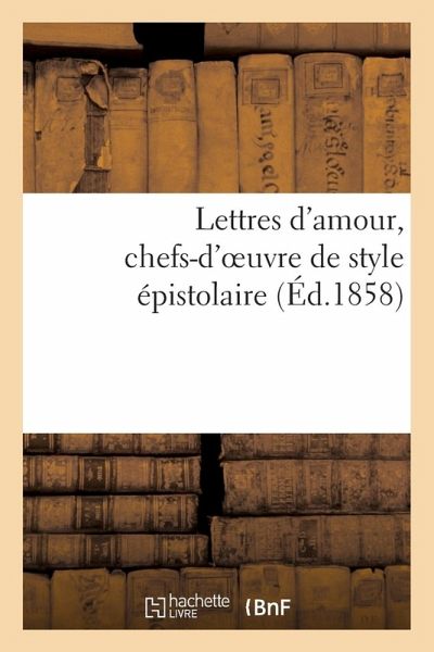 Lettres d'amour, chefs-d'oeuvre de style épistolaire choisis dans les plus grands [...] Héloise, Abeilard, la religieuse portugaise, [...], Mademoiselle de Lespinasse... Date de l'édition originale: 1858 Le présent ouvrage s'inscrit dans une politique de conservation patrimoniale des ouvrages de la littérature Française mise en place avec la BNF. HACHETTE LIVRE et la BNF proposent ainsi un catalogue de titres indisponibles, la BNF ayant numérisé ces oeuvres et HACHETTE LIVRE les imprimant à la demande. Certains de ces ouvrages reflètent des courants de pensée caractéristiques de leur époque, mais qui seraient aujourd'hui jugés condamnables. Ils n'en appartiennent pas moins à l'histoire des idées en France et sont susceptibles de présenter un intérêt scientifique ou historique. Le sens de notre démarche éditoriale consiste ainsi à permettre l'accès à ces oeuvres sans pour autant que nous en cautionnions en aucune façon le contenu. Pour plus d'informations, rendez-vous sur www.hachettebnf.fr