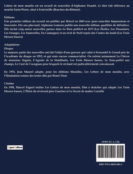 Lettres de mon moulin est un recueil de nouvelles d'Alphonse Daudet. Le titre fait référence au moulin Saint-Pierre, situé à Fontvieille (Bouches-du-Rhône)1. Éditions Une première édition du recueil est publiée par Hetzel en 1869 avec pour sous-titre Impressions et Souvenirs. Dix ans plus tard, Alphonse Lemerre publie une nouvelle édition, qualifiée de définitive. Elle inclut cinq autres nouvelles parues dans Le Bien public4 en 1873 (Les Étoiles, Les Douaniers, Les Oranges, Les Sauterelles, En Camargue) et un récit de Noël repris des Contes du lundi (Les Trois Messes basses) Adaptations Disque La majeure partie des nouvelles ont fait l'objet d'une gravure qui valut à Fernandel le Grand prix de l'Académie du disque en 1953, et qui reste encore commercialisé. On retient notamment La Chèvre de monsieur Seguin, L'Agonie de la Sémillante, Les Trois Messes basses, Le Sous-préfet aux champs, Le Curé de Cucugnan pour lesquels le récitant est particulièrement convaincant. En 1974, Jean Maurel adapte, pour les éditions Musidisc, Les Lettres de mon moulin, avec l¿illustration sonore des textes dits par Henri Tisot. Cinéma En 1954, Marcel Pagnol réalise Les Lettres de mon moulin, film à sketches qui adapte Les Trois Messes basses, L'Élixir du révérend père Gaucher et Le Secret de maître Cornille