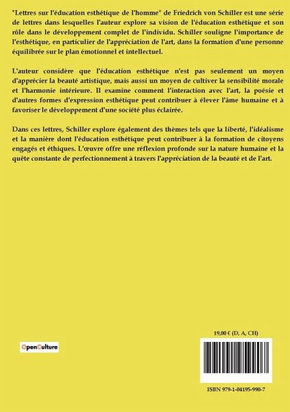 "Lettres sur l'éducation esthétique de l'homme" de Friedrich von Schiller est une série de lettres dans lesquelles l'auteur explore sa vision de l'éducation esthétique et son rôle dans le développement complet de l'individu. Schiller souligne l'importance de l'esthétique, en particulier de l'appréciation de l'art, dans la formation d'une personne équilibrée sur le plan émotionnel et intellectuel. L'auteur considère que l'éducation esthétique n'est pas seulement un moyen d'apprécier la beauté artistique, mais aussi un moyen de cultiver la sensibilité morale et l'harmonie intérieure. Il examine comment l'interaction avec l'art, la poésie et d'autres formes d'expression esthétique peut contribuer à élever l'âme humaine et à favoriser le développement d'une société plus éclairée. Dans ces lettres, Schiller explore également des thèmes tels que la liberté, l'idéalisme et la manière dont l'éducation esthétique peut contribuer à la formation de citoyens engagés et éthiques. L'¿uvre offre une réflexion profonde sur la nature humaine et la quête constante de perfectionnement à travers l'appréciation de la beauté et de l'art.