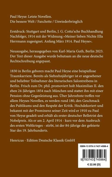 Paul Heyse: Letzte Novellen. Die bessere Welt / Fanchette / UnwiederbringlichErstdruck: Stuttgart und Berlin, J. G. Cotta'sche Buchhandlung Nachfolger, 1914 mit der Widmung »Meiner lieben Nichte Ella Herrmann zugeeignet. Anfang März 1914. Paul Heyse«.Inhaltsverzeichnis:Letzte Novellen.Begleitwort.Die bessere Welt.Fanchette.Unwiederbringlich.Neuausgabe, herausgegeben von Karl-Maria Guth, Berlin 2023.Der Text dieser Ausgabe wurde behutsam an die neue deutsche Rechtschreibung angepasst.Umschlagabbildung: Hans Andersen Brendekilde, Waldpfad im Herbst, 1902Gesetzt aus der Minion Pro, 11 pt.Die Sammlung Hofenberg erscheint im Verlag Henricus - Edition Deutsche Klassik GmbH, BerlinÜber den Autor:1830 in Berlin geboren macht Paul Heyse eine beispiellose Traumkarriere. Bereits als Siebzehnjähriger ist er angesehener und beliebter Teilnehmer des literarischen Salontreibens in Berlin. Frisch zum Dr. phil. promoviert holt Maximilian II. den eben 24-Jährigen 1854 nach München und stattet ihn mit einer Pension ohne Gegenleistung aus. Über Jahrzehnte treffen vor allem Heyses Novellen, es werden rund 180, den Geschmack des Publikums und den Respekt der Kritik. Hochdekoriert und bekannt mit der Prominenz seiner Zeit wird er 1910 zu Paul von Heyse geadelt und erhält als erster deutscher Belletrist den Nobelpreis. Als er am 2. April 1914 - kurz vor dem Ausbruch des ersten Weltkrieges - stirbt, ist der 84-jährige der gefeierte Star des 19. Jahrhunderts.