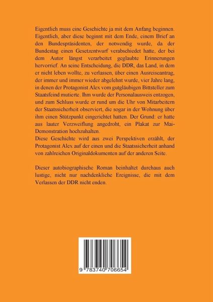 Eigentlich beginnt eine Geschichte ja mit dem Anfang. Eigentlich, diese muss allerdings mit dem Ende beginnen. Mit einem Brief an den Bundespräsidenten, der für den Protagonisten Alex notwendig wird, da sich alles zu wiederholen scheint. Als längst verarbeitet geglaubte Ereignisse aus seiner Kindheit und Jugend in der DDR ihn während einer Nachrichtensendung einholen. Die Antwort auf seinen Brief lässt nicht lange auf sich warten, stellt ihn allerdings nicht wirklich zufrieden. Fortan beschäftigt ihn ein Gedanke, sich einzumischen, sein Anliegen deutlich zu machen. Auch für die Menschen, die nicht in der DDR gelebt haben und für die Generation, für die Erich Honecker so etwas ist wie Napoleon oder Hitler, jemand aus den Geschichtsbüchern. Er beschließt, seine Geschichte aufzuschreiben, zu erzählen. Aber auch die Staatssicherheit erzählt eine Version der Geschichte, aus ihrer Sicht, durch zahlreiche Originalunterlagen, die zeitlich und situativ eingefügt werden. Beginnend mit den ersten Wahrnehmungen seines Lebens, die zufällig das gemeinsame Auspacken eines Westpaketes innerhalb der Familie mit den unverwechselbaren Gerüchen sind, über seine Schul- und Ausbildungszeit mit Schlüsselerlebnissen, die nach und nach in ihm den Entschluss reifen lassen, dieses Land zu verlassen. Legal über einen Antrag, mit der naiven Vorstellung, es nur richtig erklären zu müssen. Jede Ablehnung seines Antrages zieht eine neue Antragsstellung nach sich, die Alex nach und nach radikalisierte.