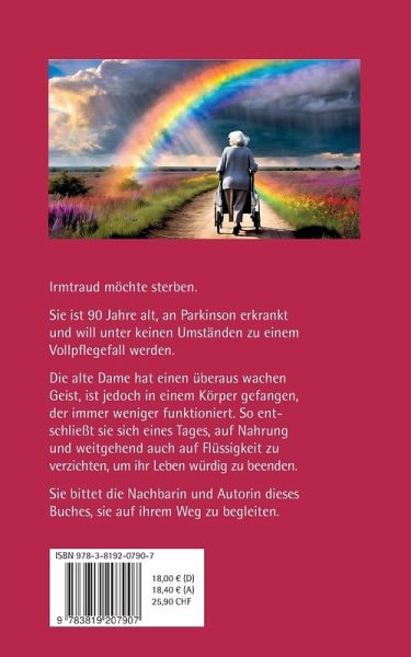 Irmtraud möchte sterben. Sie ist 90 Jahre alt, an Parkinson erkrankt und will unter keinen Umständen zu einem Vollpflegefall werden. Die alte Dame hat einen überaus wachen Geist, ist jedoch in einem Körper gefangen, der immer weniger funktioniert. So entschließt sie sich eines Tages, auf Nahrung und weitgehend auch auf Flüssigkeit zu verzichten, um ihr Leben würdig zu beenden. Sie bittet die Nachbarin und Autorin dieses Buches, sie auf ihrem Weg, der 16 Tage dauern wird, zu begleiten.
