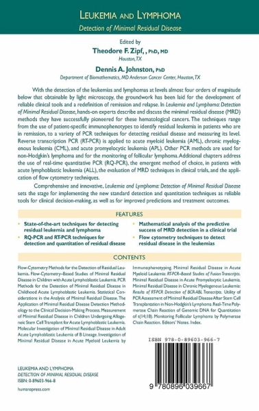 "The book provides an excellent presentation of a wide spectrum of methods used in detection of MRD in ALL, CML, AML and Hodgkins lymphoma. It will certainly be of great help for all those, who are engaged in modern management of leukemias and lymphomas." -Neoplasma
