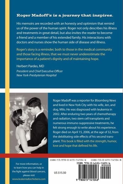 Roger Madoff was diagnosed with leukemia in 2002. After enduring two years of chemotherapy and radiation, two stem-cell transplants and numerous immuno-suppressive treatments, he felt strong enough to write about his experience. Roger was a reporter for Bloomberg News and lived in New York City with his wife, Jen, and dog, Milo. He died on April 15, 2006, at the age of 32, from the debilitating side effects of his second transplant. This book is filled with the strength, humor, love and hope that defined his life. For more information, please visit: www.leukemiaforchickens.com
