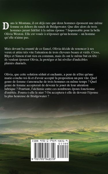 Dans le Montana, il est déjà rare que deux hommes épousent une même femme en dehors du ranch de Bridgewater. Que dire alors de trois hommes jurant fidélité à la même épouse ? Impensable pour la belle Olivia Weston. Elle est vouée à n'épouser qu'un homme – un homme qu’elle n'aime pas. Mais devant la cruauté de ce fiancé, Olivia décide de renoncer à ses vœux et attire très vite l'attention de trois éleveurs beaux et virils. Cross, Rhys et Simon n'ont rien en commun, mais ils ont le même but en tête : ils veulent épouser Olivia, la protéger et lui révéler d'indicibles plaisirs charnels. Olivia, que cette solution séduit et enchante, a peur de n'être qu'une marie-couche-toi-là et d'avoir accepté la proposition un peu vite. Quel genre de femme s'amourache de trois hommes en même temps ? Quel genre de femme accepterait de devenir le jouet de leur attention lubrique ? Pourtant, l'alchimie entre ces nombreux époux fonctionne d'emblée. Pourra-t-elle le nier ? Ou acceptera-t-elle de devenir l'épouse la plus heureuse de Bridgewater ?