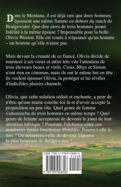 Dans le Montana, il est déjà rare que deux hommes épousent une même femme en dehors du ranch de Bridgewater. Que dire alors de trois hommes jurant fidélité à la même épouse ? Impensable pour la belle Olivia Weston. Elle est vouée à n'épouser qu'un homme – un homme qu’elle n'aime pas. Mais devant la cruauté de ce fiancé, Olivia décide de renoncer à ses vœux et attire très vite l'attention de trois éleveurs beaux et virils. Cross, Rhys et Simon n'ont rien en commun, mais ils ont le même but en tête : ils veulent épouser Olivia, la protéger et lui révéler d'indicibles plaisirs charnels. Olivia, que cette solution séduit et enchante, a peur de n'être qu'une marie-couche-toi-là et d'avoir accepté la proposition un peu vite. Quel genre de femme s'amourache de trois hommes en même temps ? Quel genre de femme accepterait de devenir le jouet de leur attention lubrique ? Pourtant, l'alchimie entre ces nombreux époux fonctionne d'emblée. Pourra-t-elle le nier ? Ou acceptera-t-elle de devenir l'épouse la plus heureuse de Bridgewater ?