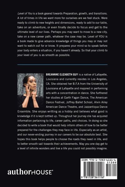 Breannne Elizabeth Guy is a native of Lafayette, Louisiana and currently resides in Los Angeles, CA. She obtained her B.F.A from the Univerisity of Louisiana at Lafayette and majored in performing arts with a concentration in dance. She furthered her studies at Garth Fagan Dance, The American Dance Festival, Joffrey Ballet School, Alvin Ailey American Dance Theatre, and Jazzantiqua Dance Ensemble. She enjoys writting as a hobby and believes what good is knowledge if it is kept bottled up. Throughout her journey she has acquired information pertaining to life, career paths, and choices. In doing so she decided to write a book that would help inform others of how to be better prepared for the challenges they may face in life. Especially as an artist, and our never-ending journey in our careers to be our absolute best. She hopes this book helps people to choose the roads they need in life, and to better smooth sail towards their achievements. May you one day get to a level of infinite wonders and live a life you could not possibly imagine.