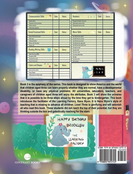 Book 3 is the epiphany of the series. This book is designed to show America and the world that children aged three can learn properly whether they are normal, have a developmental disability, or have any physical problems. All universities, educators, teachers, and caregivers of children aged three will enjoy the attributes. Book 3 will show the universe that it is possible to be three steps ahead by the time they get to kindergarten. This book introduces the facilitator of the Learning Factory, Nana Wynn. It is Nana Wynn's style of teaching that is missing to advance all children. Level Three is glorifying and will astonish all who read this book. These students did not reach the top of their potential, but they are thinking outside the box and galactically reaching for the stars.