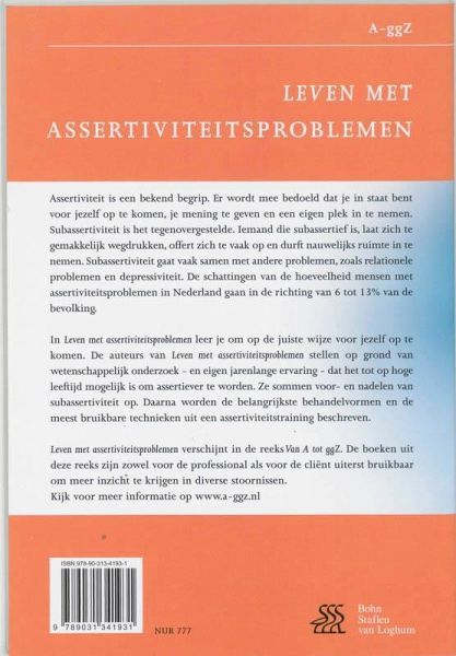 Assertiviteit is een bekend begrip. Er wordt mee bedoeld dat je in staat bent voor jezelf op te komen, je mening te geven en een eigen plek in te nemen. Subassertiviteit is het tegen-overgestelde. Iemand die subassertief is, laat zich te gemakkelijk wegdrukken, offert zich te vaak op en durft nauwelijks ruimte in te nemen. Subassertiviteit gaat vaak samen met andere problemen, zoals relationele problemen en depressiviteit. De schattingen van de hoeveelheid mensen met assertiviteitsproblemen in Nederland gaan in de richting van 6 - 13 % van de bevolking. De auteurs van Leven met assertiviteitsproblemen stellen op grond van weten-schappelijk onderzoek -en eigen jarenlange ervaring -dat het tot op hoge leeftijd mogelijk is om assertiever te worden. Ze sommen voor- en nadelen van subassertiviteit op. Daarna worden de belangrijkste behandelvormen en de meest bruikbare technieken uit een asser-tiviteitstraining beschreven. Leven met assertiviteitsproblemen verschijnt in de reeks Van A tot ggZ. De boeken uit deze reeks zijn zowel voor de professional als voor de cliënt uiterst bruikbaar om meer inzicht te krijgen in diverse stoornissen.