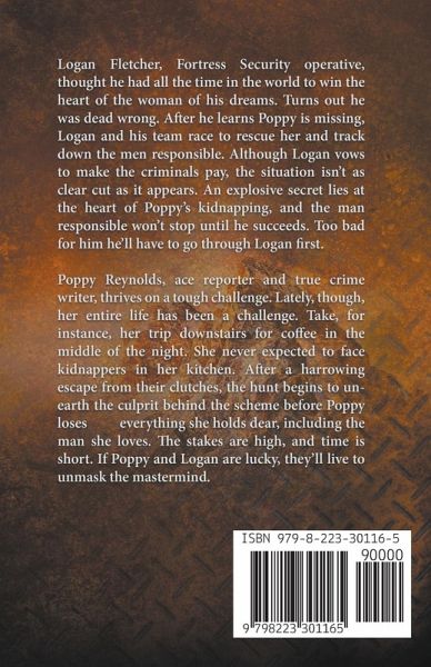 Logan Fletcher, Fortress Security operative, thought he had all the time in the world to win the heart of the woman of his dreams. Turns out he was dead wrong. After he learns Poppy is missing, Logan and his team race to rescue her and track down the men responsible. Although Logan vows to make the criminals pay, the situation isn't a clear cut as it appears. An explosive secret lies at the heart of Poppy's kidnapping, and the man responsible won't stop until he succeeds. Too bad for him he'll have to go through Logan first. Poppy Reynolds, ace reporter and true crime writer, thrives on a tough challenge. Lately, though, her entire life has been a challenge. Take, for instance, her trip downstairs for coffee in the middle of the night. She never expected to face kidnappers in her kitchen. After a harrowing escape from their clutches, the hunt begins to unearth the culprit behind the scheme before Poppy loses everything she holds dear, including the man she loves. The stakes are high, and time is short. If Poppy and Logan are lucky, they'll live to unmask the mastermind.