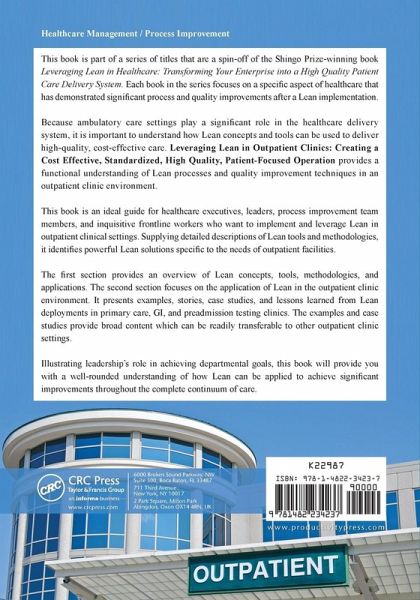 This book is part of a series of titles that are a spin-off of the Shingo Prize-winning book Leveraging Lean in Healthcare: Transforming Your Enterprise into a High Quality Patient Care Delivery System. Each book in the series focuses on a specific aspect of healthcare-including emergency departments, medical laboratories, outpatient clinics, ancillary services, and surgical services-that has demonstrated significant process and quality improvements after a Lean implementation. Because ambulatory care settings play a significant role in the healthcare delivery system, it is important to understand how Lean concepts and tools can be used to deliver high-quality, cost-effective care. Leveraging Lean in Outpatient Clinics: Creating a Cost Effective, Standardized, High Quality, Patient-Focused Operation provides a functional understanding of Lean processes and quality improvement techniques in an outpatient clinic environment. This book is an ideal guide for healthcare executives, leaders, process improvement team members, and inquisitive frontline workers who want to implement and leverage Lean in outpatient clinical settings. Supplying detailed descriptions of Lean tools and methodologies, it identifies powerful Lean solutions specific to the needs of outpatient facilities. The first section provides an overview of Lean concepts, tools, methodologies, and applications. The second section focuses on the application of Lean in the outpatient clinic environment. It presents illustrative examples of Lean deployments in primary care, GI, and preadmission testing clinics. The examples provide broad content which can be readily transferable to other outpatient clinic settings. Illustrating leadership's role in achieving departmental goals, this book will provide you with a well-rounded understanding of how Lean can be applied to achieve significant improvements throughout the complete continuum of care.
