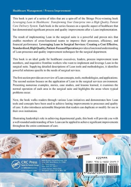 This book is part of a series of titles that are a spin-off of the Shingo Prize-winning book Leveraging Lean in Healthcare: Transforming Your Enterprise into a High Quality Patient Care Delivery System. Each book in the series focuses on a specific aspect of healthcare that has demonstrated significant process and quality improvements after a Lean implementation. The result of implementing Lean in the surgical suite is a powerful and proven mix that enables members of cross-functional teams to improve their processes, efficiency, and financial performance. Leveraging Lean in Surgical Services: Creating a Cost Effective, Standardized, High Quality, Patient-Focused Operation provides a functional understanding of Lean processes and quality improvement techniques for the surgical department. This book is an ideal guide for healthcare executives, leaders, process improvement team members, and inquisitive frontline workers who want to implement and leverage Lean in the surgical suite. Supplying detailed descriptions of Lean tools and methodologies, it identifies powerful solutions specific to the needs of surgical services. The first section provides an overview of Lean concepts, tools, methodologies, and applications. The second section focuses on the application of Lean in the surgical services environment. Presenting numerous examples, stories, case studies, and lessons learned, it examines the normal operation of each area in the surgical suite and highlights the areas where typical problems occur. Next, the book walks readers through various Lean initiatives and demonstrates how Lean tools and concepts have been used to achieve lasting improvements to processes and quality of care. It also introduces actionable blueprints that readers can duplicate or modify for use in their own institutions. Illustrating leadership's role in achieving departmental goals, this book will provide you with a well-rounded understanding of how Lean can be applied to achieve significant improvements throughout the entire continuum of care.
