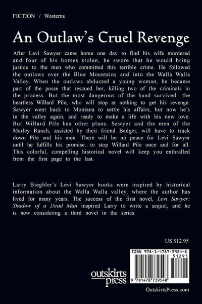 An Outlaw's Cruel Revenge... After Levi Sawyer came home one day to find his wife murdered and four of his horses stolen, he swore that he would bring justice to the men who committed this terrible crime. He followed the outlaws over the Blue Mountains and into the Walla Walla Valley. When the outlaws abducted a young woman, he became part of the posse that rescued her, killing two of the criminals in the process. But the most dangerous of the band survived...the heartless Willard Pile, who will stop at nothing to get his revenge. Sawyer went back to Montana to settle his affairs, but now he's in the valley again, and ready to make a life with his new love. But Willard Pile has other plans. Sawyer and the men of the Marley Ranch, assisted by their friend Badger, will have to track down Pile and his men. There will be no peace for Levi Sawyer until he fulfills his promise...to stop Willard Pile once and for all. This colorful, compelling historical novel will keep you enthralled from the first page to the last.