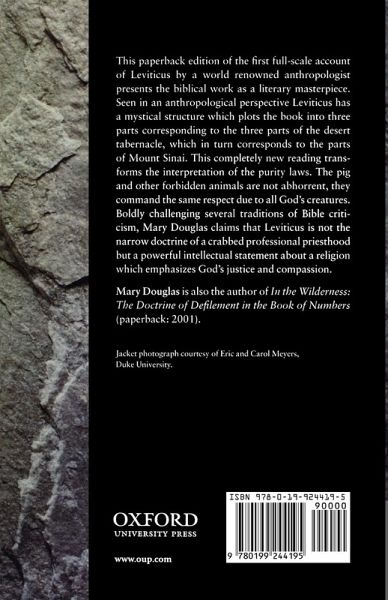 This first full-scale account of Leviticus by a world renowned anthropologist presents the biblical work as a literary masterpiece. Seen in an anthropological perspective Leviticus has a mystical structure which plots the book into three parts corresponding to the three parts of the desert tabernacle, both corresponding to the parts of Mount Sinai. This completely new reading transforms the interpretation of the purity laws. The pig and other forbidden animals are not abhorrent, they command the same respect due to all God's creatures. Boldly challenging several traditions of Bible criticism, Mary Douglas claims that Leviticus is not the narrow doctrine of a crabbed professional priesthood but a powerful intellectual statement about a modern religion which emphasizes God's justice and compassion.