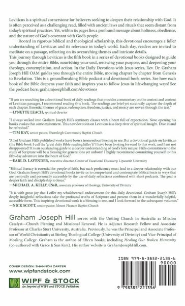 Leviticus is a spiritual cornerstone for believers seeking to deepen their relationship with God. It is often perceived as a challenging read, filled with ancient laws and rituals that seem distant from today's spiritual practices. Yet, within its pages lies a profound message about holiness, obedience, and the nature of God's covenant with God's people. Rooted in rigorous biblical and theological scholarship, this devotional encourages a fuller understanding of Leviticus and its relevance in today's world. Each day, readers are invited to meditate on a passage, reflecting on its overarching themes and intricate details. This journey through Leviticus is the fifth book in a series of devotional books designed to guide you through the entire Bible, nourishing your soul, renewing your purpose, and deepening your theology, contemplation, and action. In the Daily Devotions with Jesus series, Rev. Dr. Graham Joseph Hill OAM guides you through the entire Bible, moving chapter by chapter from Genesis to Revelation. This is a groundbreaking Bible podcast and devotional book series. See how each book of the Bible deepens your faith and inspires you to follow Jesus in life-changing ways! See the podcast here: grahamjosephhill.com/devotions