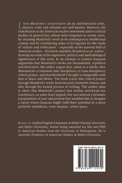Lewis Mumford's achievements as an architectural critic, literary critic and urbanist are well known. However, his contribution to the American studies movement and to cultural studies in general has almost been forgotten in recent years. By situating Mumford's work in its contemporary intellectual context and by considering some of its legacies for the study of 'culture and civilization' - especially in the nascent field of American studies - this book considers Mumford as an 'author', drawing out some of the expressive, political and methodological significance of this term. In an attempt to counter frequent arguments that Mumford's works are inconsistent, repetitive and derivative, the author argues that, taken as a whole, they demonstrate a consistent inter-disciplinary or trans-disciplinary critical project, and that Mumford's thought is comparable with that of Marx and Weber. The book traces this critical project through Mumford's works from the early twentieth century and also through his formal process of writing. The author aims to show that Mumford's project was neither provincial nor reactionary, as some have argued, but was instead a dynamic juxtaposition of past and present that enabled him to imagine a future where humans might fulfil their potential in a more perfectly republican, even utopian, urban space.