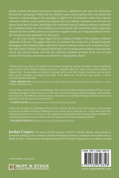 Martin Luther's theological revolution depended in a significant part upon the distinction between law and gospel. Within the last hundred years, several authors have reevaluated the reformer's understanding of this paradigm in light of its development within the Lutheran orthodox tradition. Some authors have argued that the Lutheran scholastic view of God's law departs from that of Luther. Specifically, it is contended that the Lutheran orthodox argued for a definition of the law which defines it as God's eternal will in contradiction to Luther's approach, wherein the law is defined almost exclusively in negative terms, as a temporal order to eventually be replaced and superseded by the gospel. In this work, Jordan Cooper argues for the continued validity of the Lutheran orthodox definition of the law. Throughout this text, he contrasts the perspective of Radical Lutheran theologians, like Gerhard Forde, with that of earlier Lutheran writers such as Martin Chemnitz and Johann Gerhard. It is argued that Forde's view is inadequate to address contemporary ethical and pastoral issues, and that the Lutheran scholastic doctrine of the law as God's eternal will remains a necessary concept for the contemporary church.