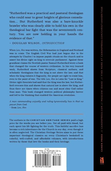 "A man commanding unjustly and ruling tyrannically has in that no power from God." When Lex, Rex was written, the Reformation in England and Scotland was in crisis. The English Civil War had just begun after Charles I tried to impose popish rituals on the church and asserted his divine right as king to overrule parliament. Against these grandiose claims the Scottish pastor Samuel Rutherford wrote a book and changed western political philosophy forever as it led to the thinking that enabled the American revolution. In his very learned work, Rutherford shows from Scripture, classical authors, and scholastic theologians that the king is not above the law; and that when the king violates it flagrantly, the people are right to resist him, even to the point of war. The title Lex Rex is Latin for "Law is King". Divine right theorists had said that the King was the law, but Rutherford reverses this and shows that natural law is above the king, and thus there are times when citizens can and must obey God rather than man. "Rutherford was a practical and pastoral theologian who could soar to great heights of glorious consolation. . . But Rutherford was also a bare-knuckle brawler who was clearly able to hold his own in the theological bar fight that was the seventeenth century. You are now holding in your hands the evidence of that." ~ Introduction by Douglas Wilson