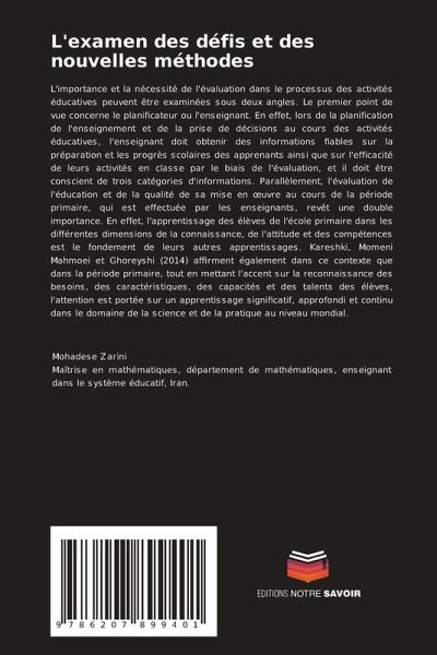 L'importance et la nécessité de l'évaluation dans le processus des activités éducatives peuvent être examinées sous deux angles. Le premier point de vue concerne le planificateur ou l'enseignant. En effet, lors de la planification de l'enseignement et de la prise de décisions au cours des activités éducatives, l'enseignant doit obtenir des informations fiables sur la préparation et les progrès scolaires des apprenants ainsi que sur l'efficacité de leurs activités en classe par le biais de l'évaluation, et il doit être conscient de trois catégories d'informations. Parallèlement, l'évaluation de l'éducation et de la qualité de sa mise en oeuvre au cours de la période primaire, qui est effectuée par les enseignants, revêt une double importance. En effet, l'apprentissage des élèves de l'école primaire dans les différentes dimensions de la connaissance, de l'attitude et des compétences est le fondement de leurs autres apprentissages. Kareshki, Momeni Mahmoei et Ghoreyshi (2014) affirment également dans ce contexte que dans la période primaire, tout en mettant l'accent sur la reconnaissance des besoins, des caractéristiques, des capacités et des talents des élèves, l'attention est portée sur un apprentissage significatif, approfondi et continu dans le domaine de la science et de la pratique au niveau mondial.