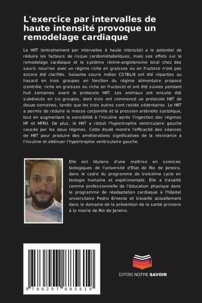 Le HIIT (entraînement par intervalles à haute intensité) a le potentiel de réduire les facteurs de risque cardiométaboliques, mais ses effets sur le remodelage cardiaque et le système rénine-angiotensine local chez des souris nourries avec un régime riche en graisses ou en fructose n'ont pas encore été clarifiés. Soixante souris mâles C57BL/6 ont été réparties au hasard en trois groupes en fonction du régime alimentaire proposé (contrôle, riche en graisses ou riche en fructose) et ont été suivies pendant huit semaines avant le protocole HIIT. Les animaux ont ensuite été subdivisés en six groupes, dont trois ont commencé un protocole HIIT de douze semaines, tandis que les trois autres sont restés sédentaires. Le HIIT a permis de réduire la masse corporelle et la pression artérielle systolique, tout en augmentant la sensibilité à l'insuline après l'ingestion des régimes HF et HFRU. De plus, le HIIT a réduit l'hypertrophie ventriculaire gauche causée par les deux régimes. Cette étude montre l'efficacité des séances de HIIT pour produire des améliorations significatives de la résistance à l'insuline et atténuer l'hypertrophie ventriculaire gauche.