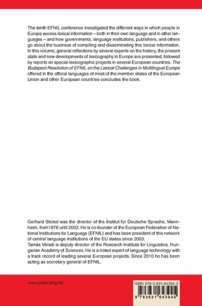 The tenth EFNIL conference investigated the different ways in which people in Europe access lexical information - both in their own language and in other languages - and how governments, language institutions, publishers, and others go about the business of compiling and disseminating this lexical information. In this volume, general reflections by several experts on the history, the present state and new developments of lexicography in Europe are presented, followed by reports on special lexicographic projects in several European countries. The Budapest Resolution of EFNIL on the Lexical Challenges in Multilingual Europe offered in the official languages of most of the member states of the European Union and other European countries concludes the book.