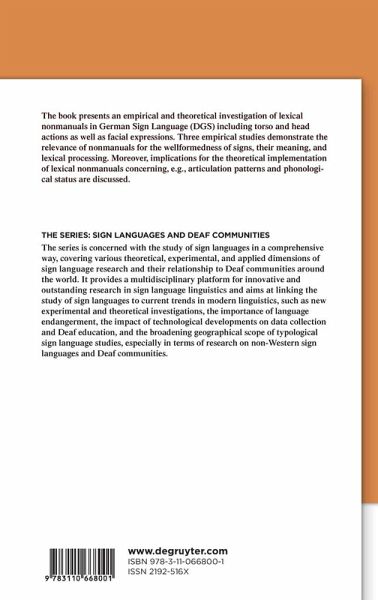 The book presents an empirical and theoretical investigation of lexical nonmanuals in German Sign Language including torso, head, and facial expressions. Three empirical studies demonstrate the relevance of nonmanuals for the wellformedness of signs, their meaning, and lexical processing. Moreover, implications for the theoretical implementation of lexical nonmanuals concerning, e.g., articulation patterns and phonological status are discussed.