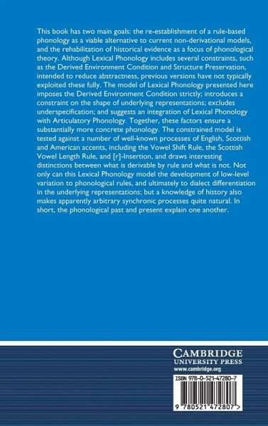 This book has two main goals: the re-establishment of a rule-based phonology as a viable alternative to current non-derivational models, and the rehabilitation of historical evidence as a focus of phonological theory. Although lexical phonology includes several constraints, such as the Derived Environment Condition and Structure Preservation, intended to reduce abstractness, previous versions have not typically exploited these fully. The model of lexical phonology presented here imposes the Derived Environment Condition strictly; introduces a new constraint on the shape of underlying representations; excludes underspecification; and suggests an integration of lexical phonology with articulatory phonology. Together, these innovations ensure a substantially more concrete phonology. The constrained model is tested against a number of well-known processes of English, Scottish and American accents, including the Vowel Shift Rule, the Scottish Vowel Length Rule, and [r]-insertion, and draws interesting distinctions between what is derivable by rule and what is not.