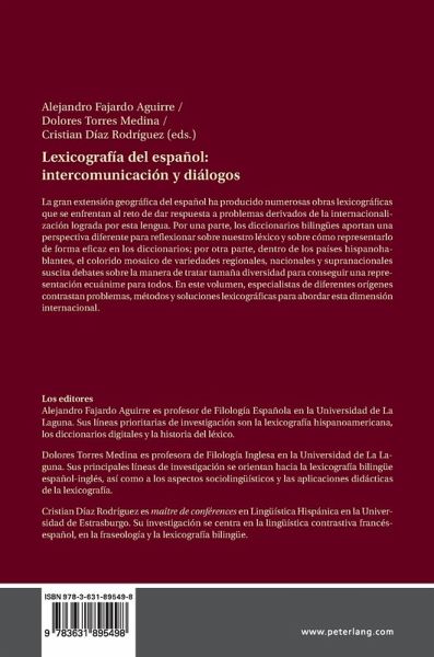 Alejandro Fajardo Aguirre es profesor de Filología Española en la Universidad de La Laguna. Sus líneas prioritarias de investigación son la lexicografía hispanoamericana, los diccionarios digitales y la historia del léxico. Dolores Torres Medina es profesora de Filología Inglesa en la Universidad de La Laguna. Sus principales líneas de investigación se orientan hacia la lexicografía bilingüe español-inglés, así como a los aspectos sociolingüísticos y las aplicaciones didácticas de la lexicografía. Cristian Díaz Rodríguez es maître de conférences en Lingüística Hispánica en la Universidad de Estrasburgo. Su investigación se centra en la lingüística contrastiva francés-español, en la fraseología y la lexicografía bilingüe.