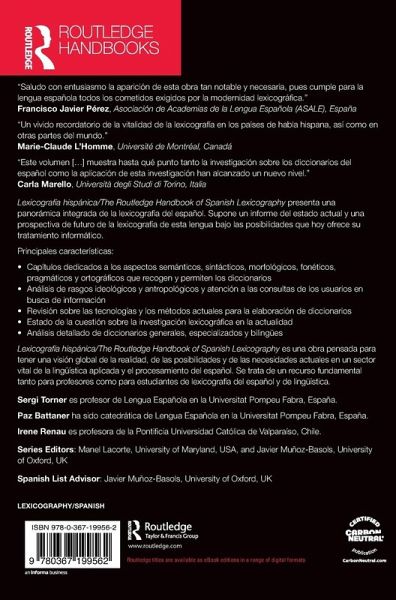 Lexicografía hispánica / The Routledge Handbook of Spanish Lexicography offers an integrated perspective on the lexicography of Spanish. It presents a report on the current state and insight on the future of the lexicography of Spanish relying on the possibilities that computer processing provides.