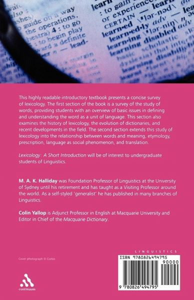 This readable introductory textbook presents a concise survey of lexicology. The first section of the book is a survey of the study of words, providing students with an overview of basic issues in defining and understanding the word as a unit of language. This section also examines the history of lexicology, the evolution of dictionaries and recent developments in the field. The second section extends this study of lexicology into the relationship between words and meaning, etymology, prescription, language as social phenomenon and translation. Lexicology: A Short Introduction will be of interest to undergraduate students of linguistics.