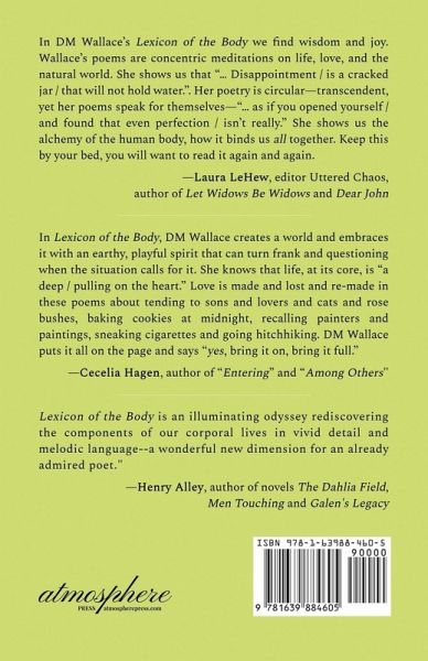 The poems in Lexicon of the Body are grounded in the physical experiences of intimacy and separation, perpetual change and transformation. Sometimes quiet, sometimes fierce and always direct, these poems dive into the deep end of the ordinary joys and the big questions of a human life lived through the body and the senses. In these poems relationships of all kinds come together, unfold, and fall apart. Children and lovers, parents and spouses, as well as pets, gardens, and a love for the earth and the landscape invite the reader into a world both private and particular, and yet deeply universal. Exploring themes of desire and gratitude, as well as disappointment and loss, the focus rests upon honesty and authenticity. In Lexicon of the Body by DM Wallace we are reminded that the beauty and wonder of the human body binds us all together. While we think of our forms as private and precious only to us, through them we learn empathy, wisdom, and a sense of belonging to each other that transcends language.