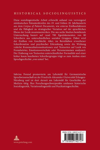 Diese soziolinguistische Arbeit erforscht anhand von vorwiegend süddeutschen Patientenbriefen des 19. und frühen 20. Jahrhunderts aus dem Corpus of Patient Documents, wie externe Einflussfaktoren und die Fähigkeit zu strategischer Variation auf der sprachlichen Ebene der Lexik zusammenwirken. Die aus sechs Studien bestehende Untersuchung basiert auf rund 700 Egodokumenten von 80 Schreibern aus unterschiedlichen sozialen Gruppen. Dabei wird der Einfluss von Geschlecht, Alter, im Berufsleben erworbener Schreibroutine und psychischer Erkrankung sowie die Wirkung vielerlei Kommunikationssituationen und Textsorten auf Lexik wie Fremdwörter, Emotionswortschatz oder Personennamen analysiert. Der Einbezug von Textsorten unterschiedlicher Formalität und einer bisher kaum beachteten Schreibergruppe trägt so zum Ausbau einer Sprachgeschichte "von unten" bei.