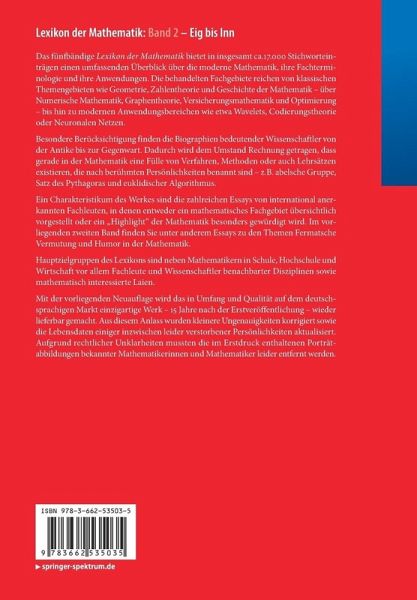 Das fünfbändige "Lexikon der Mathematik" bietet in insgesamt ca.17.000 Stichworteinträgen einen umfassenden Überblick über die moderne Mathematik, ihre Fachterminologie und ihre Anwendungen. Die behandelten Fachgebiete reichen von klassischen Themengebieten wie Geometrie, Zahlentheorie und Geschichte der Mathematik - über Numerische Mathematik, Graphentheorie, Versicherungsmathematik und Optimierung - bis hin zu modernen Anwendungsbereichen wie etwa Wavelets, Codierungstheorie oder Neuronalen Netzen. Besondere Berücksichtigung finden die Biographien bedeutender Wissenschaftler von der Antike bis zur Gegenwart. Dadurch wird dem Umstand Rechnung getragen, dass gerade in der Mathematik eine Fülle von Verfahren, Methoden oder auch Lehrsätzen existieren, die nach berühmten Persönlichkeiten benannt sind - z.B. abelsche Gruppe, Satz desPythagoras und euklidischer Algorithmus. Ein Charakteristikum des Werkes sind die zahlreichen Essays von international anerkannten Fachleuten, in denen entweder ein mathematisches Fachgebiet übersichtlich vorgestellt oder ein "Highlight" der Mathematik besonders gewürdigt wird. Im vorliegenden zweiten Band finden Sie unter anderem Essays zu den Themen Fermatsche Vermutung und Humor in der Mathematik. Hauptzielgruppen des Lexikons sind neben Mathematikern in Schule, Hochschule und Wirtschaft vor allem Fachleute und Wissenschaftler benachbarter Disziplinen sowie mathematisch interessierte Laien.Mit der vorliegenden Neuauflage wird das in Umfang und Qualität auf dem deutschsprachigen Markt einzigartige Werk - 15 Jahre nach der Erstveröffentlichung - wieder lieferbar gemacht. Aus diesem Anlass wurden kleinere Ungenauigkeiten korrigiert sowie die Lebensdaten einiger inzwischen leider verstorbener Persönlichkeiten aktualisiert. Aufgrund rechtlicher Unklarheiten mussten die im Erstdruck enthaltenen Porträtabbildungen bekannter Mathematikerinnen und Mathematiker leider entfernt werden.