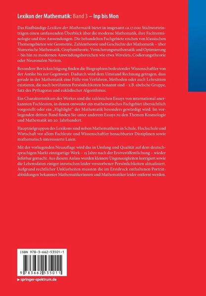 Das fünfbändige "Lexikon der Mathematik" bietet in insgesamt ca.17.000 Stichworteinträgen einen umfassenden Überblick über die moderne Mathematik, ihre Fachterminologie und ihre Anwendungen. Die behandelten Fachgebiete reichen von klassischen Themengebieten wie Geometrie, Zahlentheorie und Geschichte der Mathematik - über Numerische Mathematik, Graphentheorie, Versicherungsmathematik und Optimierung - bis hin zu modernen Anwendungsbereichen wie etwa Wavelets, Codierungstheorie oder Neuronalen Netzen. Besondere Berücksichtigung finden die Biographien bedeutender Wissenschaftler von der Antike bis zur Gegenwart. Dadurch wird dem Umstand Rechnung getragen, dass gerade in der Mathematik eine Fülle von Verfahren, Methoden oder auch Lehrsätzen existieren, die nach berühmten Persönlichkeiten benannt sind - z.B. abelsche Gruppe, Satz desPythagoras und euklidischer Algorithmus. Ein Charakteristikum des Werkes sind die zahlreichen Essays von international anerkannten Fachleuten, in denen entweder ein mathematisches Fachgebiet übersichtlich vorgestellt oder ein "Highlight" der Mathematik besonders gewürdigt wird. Im vorliegenden dritten Band finden Sie unter anderem Essays zu den Themen Kosmologie und Mathematik im 20. Jahrhundert. Hauptzielgruppen des Lexikons sind neben Mathematikern in Schule, Hochschule und Wirtschaft vor allem Fachleute und Wissenschaftler benachbarter Disziplinen sowie mathematisch interessierte Laien.Mit der vorliegenden Neuauflage wird das in Umfang und Qualität auf dem deutschsprachigen Markt einzigartige Werk - 15 Jahre nach der Erstveröffentlichung - wieder lieferbar gemacht. Aus diesem Anlass wurden kleinere Ungenauigkeiten korrigiert sowie die Lebensdaten einiger inzwischen leider verstorbener Persönlichkeiten aktualisiert. Aufgrund rechtlicher Unklarheiten mussten die im Erstdruck enthaltenen Porträtabbildungen bekannter Mathematikerinnen und Mathematiker leider entfernt werden.