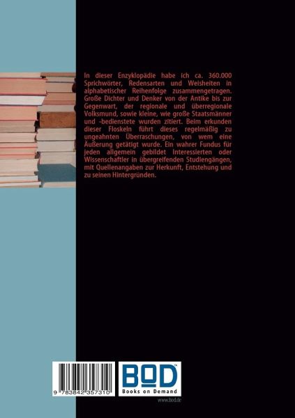 In dieser Enzyklopädie habe ich ca. 360.000 Sprichwörter, Redensarten und Weisheiten in alphabetischer Reihenfolge zusammengetragen. Große Dichter und Denker von der Antike bis zur Gegenwart, der regionale und überregionale Volksmund, sowie kleine, wie große Staatsmänner und -bedienstete wurden zitiert. Beim erkunden dieser Floskeln führt dieses regelmäßig zu ungeahnten Überraschungen, von wem eine Äußerung getätigt wurde. Ein wahrer Fundus für jeden allgemein gebildet Interessierten oder Wissenschaftler in übergreifenden Studiengängen, mit Quellenangaben zur Herkunft, Entstehung und zu seinen Hintergründen.