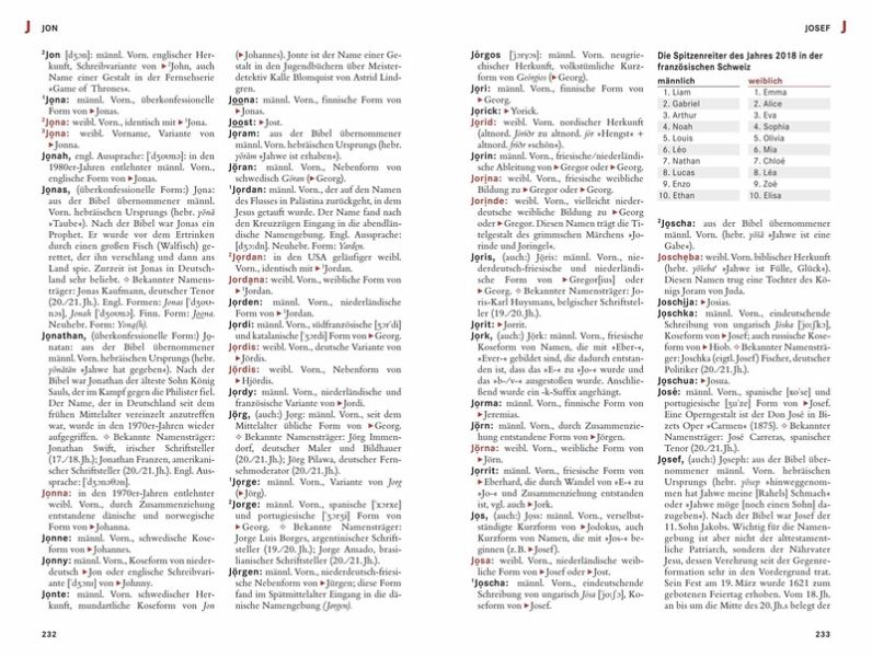 Das Lexikon der Vornamen zeigt Aussprache, Bedeutung, Herkunft und Schreibung von über 9000 Vornamen. Neben europäischen Namen sind auch Namen aus dem arabischen, asiatischen und afrikanischen Raum abgebildet. In die neue Auflage haben zahlreiche neue Namen Eingang gefunden, wie z. B. Amelina, Clarina, Lilibet, Liora, Marlie, Solea, Ilario, Junis, Kiano, Leano, Milas oder Nael. Hitlisten mit den beliebtesten Vornamen in 20 Ländern und viele Zusammenstellungen, z. B. aus Unisexnamen oder nach Endungen sortierten Namen, bieten Inspiration für die Namensuche. Die Einleitung erzählt die Geschichte der Namengebung, liefert Hintergründe zu Namenmoden und enthält viel Wissenswertes zu möglichen Schreibweisen und aktuellen rechtlichen Bestimmungen der Namengebung.
