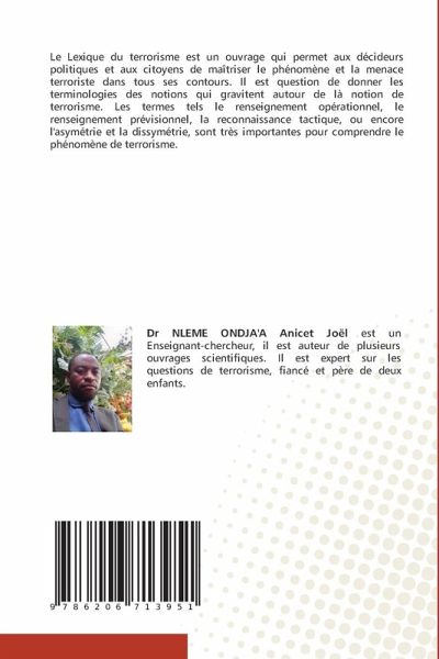 Le Lexique du terrorisme est un ouvrage qui permet aux décideurs politiques et aux citoyens de maîtriser le phénomène et la menace terroriste dans tous ses contours. Il est question de donner les terminologies des notions qui gravitent autour de là notion de terrorisme. Les termes tels le renseignement opérationnel, le renseignement prévisionnel, la reconnaissance tactique, ou encore l'asymétrie et la dissymétrie, sont très importantes pour comprendre le phénomène de terrorisme.