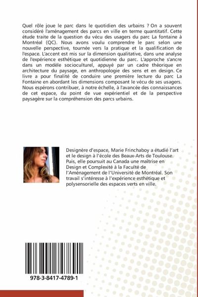 Quel rôle joue le parc dans le quotidien des urbains ? On a souvent considéré l'aménagement des parcs en ville en terme quantitatif. Cette étude traite de la question du vécu des usagers du parc La fontaine à Montréal (QC). Nous avons voulu comprendre le parc selon une nouvelle perspective, tournée vers la pratique et la qualification de l'espace. L'accent est mis sur la dimension qualitative, dans une analyse de l'expérience esthétique et quotidienne du parc. L'approche s'ancre dans un modèle socioculturel, appuyé par un cadre théorique en architecture du paysage, en anthropologie des sens et en design. Ce livre a pour finalité de conduire une première lecture du parc La Fontaine en abordant les dimensions composant le vécu de ses usagers. Nous espérons contribuer, à notre échelle, à l'avancée des connaissances de cet espace, du point de vue expérientiel et de la perspective paysagère sur la compréhension des parcs urbains.