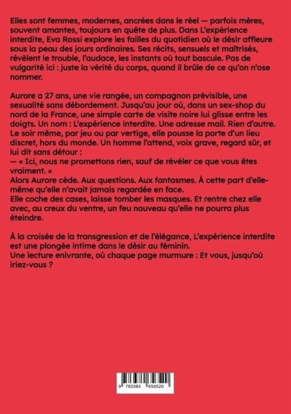 Elles sont femmes, modernes, ancrées dans le réel - parfois mères, souvent amantes, toujours en quête de plus. Dans L'expérience interdite, Eva Rossi explore les failles du quotidien où le désir affleure sous la peau des jours ordinaires. Ses récits, sensuels et maîtrisés, révèlent le trouble, l'audace, les instants où tout bascule. Pas de vulgarité ici : juste la vérité du corps, quand il brûle de ce qu'on n'ose nommer.Aurore a 27 ans, une vie rangée, un compagnon prévisible, une sexualité sans débordement. Jusqu'au jour où, dans un sex-shop du nord de la France, une simple carte de visite noire lui glisse entre les doigts. Un nom : L'expérience interdite. Une adresse mail. Rien d'autre.Le soir même, par jeu ou par vertige, elle pousse la porte d'un lieu discret, hors du monde. Un homme l'attend, voix grave, regard sûr, et lui dit sans détour :- « Ici, nous ne promettons rien, sauf de révéler ce que vous êtes vraiment. »Alors Aurore cède. Aux questions. Aux fantasmes. À cette part d'elle-même qu'elle n'avait jamais regardée en face.Elle coche des cases, laisse tomber les masques. Et rentre chez elle avec, au creux du ventre, un feu nouveau qu'elle ne pourra plus éteindre.À la croisée de la transgression et de l'élégance, L'expérience interdite est une plongée intime dans le désir au féminin.Une lecture enivrante, où chaque page murmure : Et vous, jusqu'où iriez-vous ?